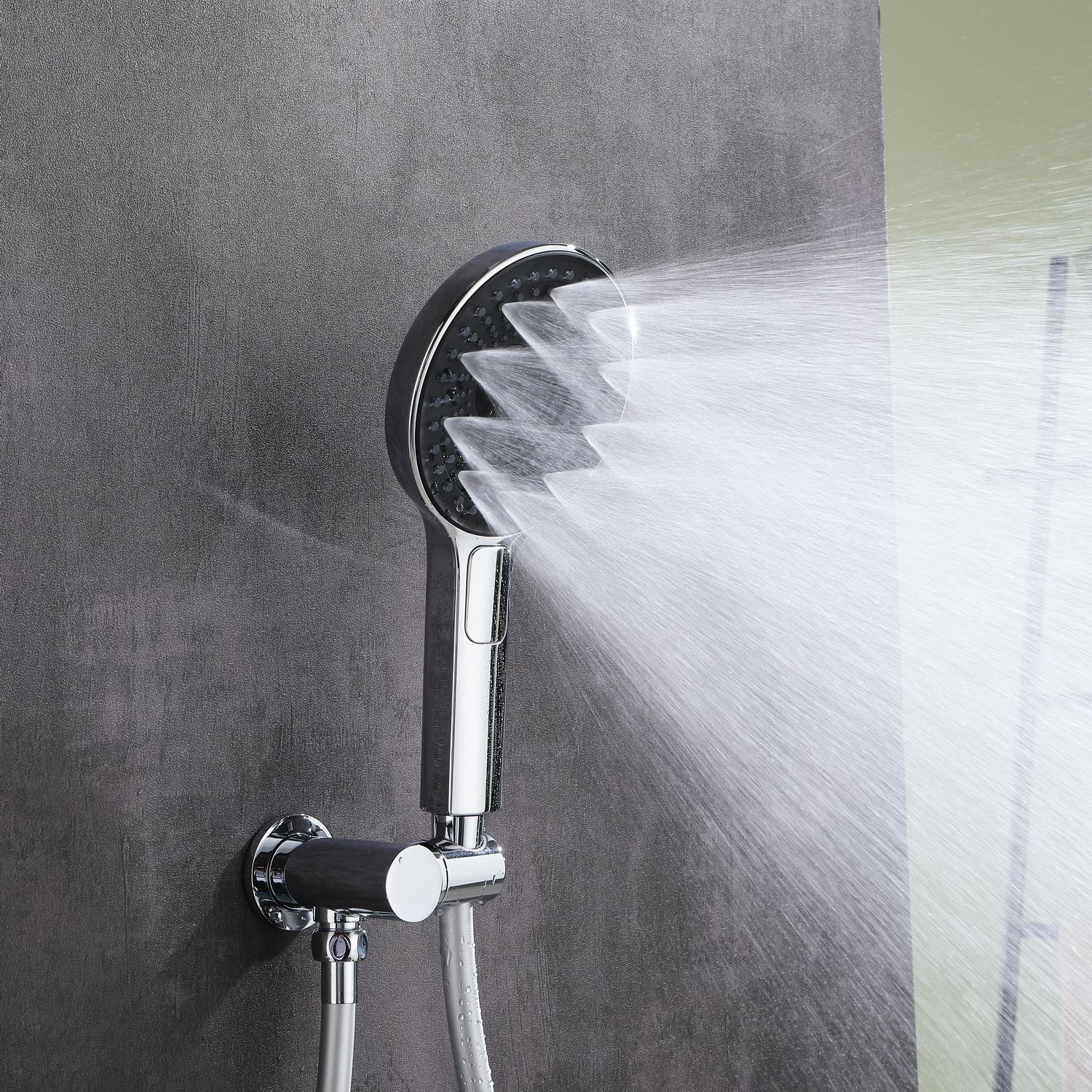 Для управления потоком воды и настройкой температуры установлен термостатический картридж прогрессивного типа с постоянным давлением, а для выбора нужного режима работы интегрированы две клавиши круглой формы. Из потребителей в комплектацию входит ручной душ с режимами, а также верхняя лейка с настенным кронштейном. Важно подчеркнуть, что в данной серии внешняя часть корпуса смесителя задекорирована вставкой под темный мрамор с разноцветными прожилками, которые акцентируют на себе внимание в любой душевой зоне.